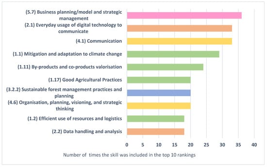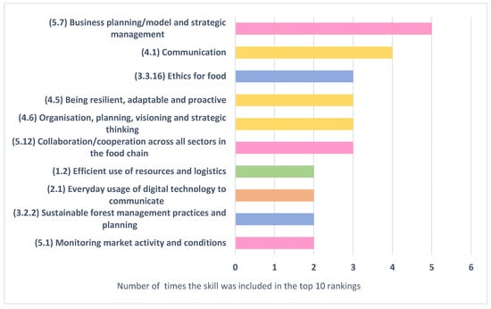 As observed for farmers as well as for agri-food company participants, business planning/model and strategic management (from the category business entrepreneurship skills) was the most selected skill followed by communication (soft skill); ethics for food (bioeconomy skill); being resilient, adaptable and proactive (soft skill); organization, planning, visioning and strategic thinking (soft skill); and collaboration/cooperation across all sectors in the food chain (business entrepreneurship skill) (Figure 5).