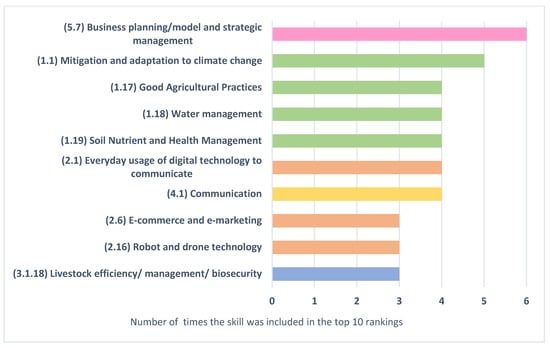 Two skills related to communication follow in the list: everyday use of digital technology to communicate (digital skill) and communication (soft skill). Communication skills were also highlighted by Bailey et al. [34], who found that young farmers’ desire to enhance their ability to communicate with family members, other people within their farm or ranch, and to develop the skills to communicate to a broader audience, such as loan officers and even the general public. Other works have also found communication skills very important for farmers and other agricultural workers [9,10,11].