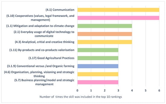 Five skills follow in the list with the same number of mentions: by-products and co-products valorization; good agricultural practices; organization, planning, visioning and strategic thinking; conventional vs./and organic farming; and business planning/model and strategic management.