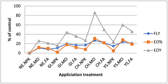Furthermore, GI.MO, GI.FA and GI.NPK were 4436,and 16, respectively. In addition, NE.MO, NE.FA, and NE.NPK were 26, 21, and 0 (control 3.192 Kg/m2), respectively as represented in Table 1 and Figure 1. Biomass, FLY, Kg/m2, EO%, EOC and Kg/m2 were significantly increased in response to elicitor, CH > YS > GI integrated with MO > FA > NPK, despite the fact that no pest infestation and microbial disease incidences in the field experiment were detected in either season without using any agrochemical pesticides and/or micro-biocides. The disappearance of any pests and microbial diseases was in agreement with [31,32].) In addition, many researchers supported our results and declared a positive, significant impact on biomass yield production [33,34].