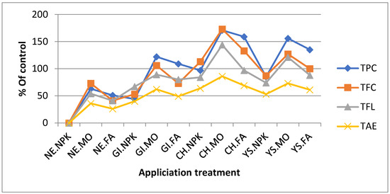 TFL, 2.55 mg QE/g. DLW, increased significantly, as % of control (Table 3 and Figure 2) as the following: values of CH.MO, CH.FA, and CH.NPK, 144, 97, and 84, respectively. Furthermore, YS.MO, YS.FA, YS. and NPK, 121, 88, and 74, respectively. In addition, values of GI.MO, GI.FA, GI, and NPK were 89, 80, and 67, respectively, and NE.MO, NE.FA, and NE NPK were 54, 41, and 0 (control = 2.55 mg QE/g DLW).