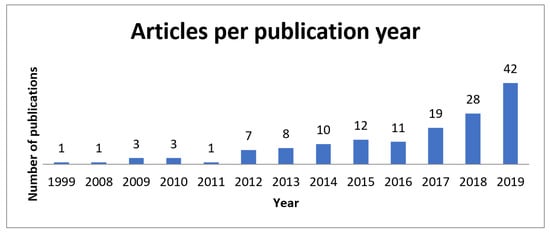 The articles included in the research only concern published peer-reviewed articles written in English and traced through Scopus, Web of Science, and Science Direct [48]. Using these, we traced 146 articles published in scientific journals. The peer-reviewed bibliography under examination consists of studies (89 articles), quantitative and qualitative general articles (56 articles), and literature reviews (one article) that cover the time frame in question. Figure 2 presents the examined articles in each publication year.
