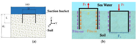 A three-dimensional finite element model of interaction between a single suction bucket and soft clay was established for offshore wind power. The truncated soil model has a radial diameter of 10D (D is the diameter of a suction bucket) and a depth of 6L (L is the length of a suction bucket) [9,14] to ignore boundary effects (Figure 3a). The dimensions of the soil model were verified to be correct by numerical simulation. To improve the computing efficiency, a half model of the bucket–soil system was used for the finite element analysis as the numerical model is symmetrical. The boundary conditions of the soil are as follows: the fixed constraint at the bottom, the lateral radial displacement in the directions of X and Y at the constrained flank of half-cylinder, and the displacement in the direction of X at the constrained symmetric cross section. A schematic diagram of the model forces is shown in Figure 3b. Ft represents the force transmitted by the superstructure, p represents the pressure difference between the pressure inside the bucket and the atmospheric pressure, Ffric-in and Ffric-out represent the frictional forces generated by the inside and outside of the bucket wall against the soil, and FQ represents the shear force.