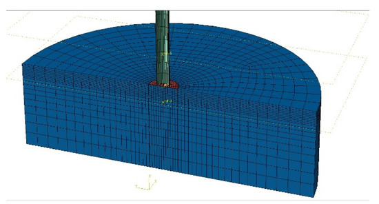 Both the suction bucket and the soil use an integral three-dimensional solid element (C3D8R) with an 8-node hexahedral linear reduction grid (Figure 4). Near the bucket–soil contact surface, cell meshes are densely divided, whereas the mesh is sparse in the soil away from the contact surface [20]. Thus, the calculation time is much shortened and the accuracy of the calculation result is improved.