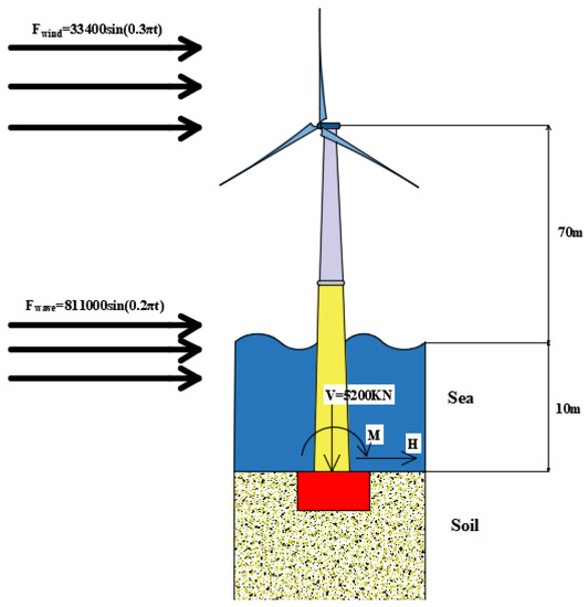 The W3600M-116 offshore wind turbine from China (with 3.6 MW installed capacity) is taken as an example in this paper. H (H = 80 m) is the distance between the hub center and the top surface of the foundation, and G0 (G0 = 5200 KN) is the weight of the superstructure transmitted to the foundation. Wind and wave loads are equivalent to horizontal cyclic loads, and cyclic loads are loaded in their respective directions.
