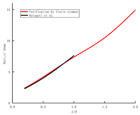 To verify the trustworthiness of the established finite element model, it was compared to existing results [27]. Gelagoti F. et al. set parameters for homogeneous clay, such as L/D = 0.2~1, = 60 kPa, and applied vertical load V = 0 and horizontal force with the method of controlling displacement. In this paper, the same parameters are used, with the exception that the length–diameter ratio (L/D) is increased to 2. When L/D is equal to 1, the calculated results are very close to those found in the literature, with a margin of error of less than 5% (Figure 6). In Figure 6, the horizontal coordinates represent the length-diameter ratio of a suction bucket, and the vertical coordinates represent the horizontal ultimate bearing capacity coefficient.
