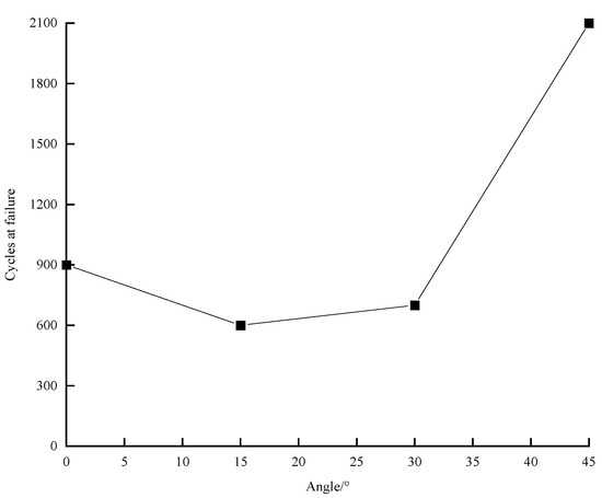 According to the static ultimate bearing capacity and the horizontal displacement corresponding to the ultimate state obtained above, the foundation is judged to have failed when the cyclic displacement amplitude of either of them reaches the ultimate displacement value under the corresponding working condition or if the overall rotation angle of the foundation is 0.05 rad and the corresponding number of cycles when the foundation fails is obtained. The difference in the bearing capacity characteristics of the foundation at different load angles was judged using the number of cycles to failure as an index to compare the bearing characteristics of the foundation. The number of cycles to failure with different wind and wave loading directions is presented in Figure 10. In Figure 10, the horizontal coordinates represent the angle between wind and wave loads, and the vertical coordinates represent the number of cycles in case of foundation failure.