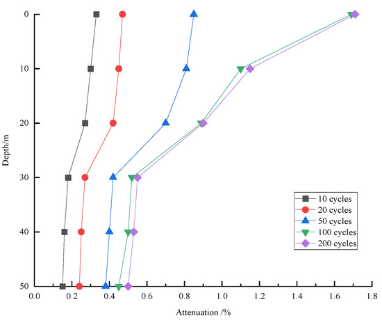 - The attenuation of soil strength is slow after 100 cycles. Because the strength of shallow soil is relatively stable after 100 cycles, the reason for the subsequent slow strength attenuation is that the strength of deep soil decreases.
