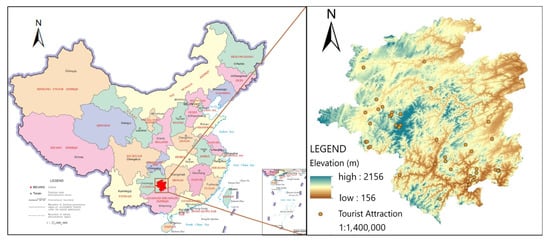 Qiandongnan Miao and Dong Autonomous Prefecture are located in the southeast of Guizhou Province, China, and at the intersection of Guizhou, Hunan, and Guangxi provinces (Figure 1). It has jurisdiction over 16 counties and cities, with a total area of 30,282.34 km2. It has a population of about 4,811,900, of which ethnic minorities account for 80.3%. Qiandongnan Prefecture is rich in tourism resources and cultural heritage. There are many tourist attractions, traditional villages, and famous historical towns in the territory. The local ethnic customs are strong, and 128 festivals with a scale of over 10,000 people are held every year. In 2019, the prefecture received 129,929,800 tourists, and the total revenue of tourism reached 121.21 billion yuan (equaling USD 17.57 billion), with year-on-year growth of 19.3% and 29.3%, respectively. Tourism has become the main economic industry in the prefecture, and most of the well-known tourist attractions in the region are rural ones. Therefore, Qiandongnan Prefecture is a highly representative case study site for studying tourism flows in southwest ethnic regions.