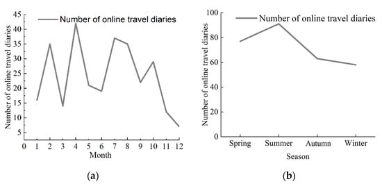 (a) The number of online travel diaries per month. (b) The number of online travel diaries in each season.