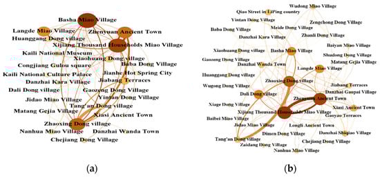 From the perspective of the tourism flow network structure in the four seasons, it was found that the main attractions that tourists visit have not changed due to seasonal changes. Xijiang Thousand Households Miao Village, Zhenyuan Ancient Town, Zhaoxing Dong Village, Basha Miao Village, and other nodes are still the main tourist attractions. It can be seen from Figure 4a,c that there are too many isolated nodes in the network structure diagrams in spring and autumn (nodes that have no connection with other nodes are isolated nodes, such as Qiao Street in LiPing country and Wudong Miao Village in Figure 4a, a total of 18 nodes). Although there are fewer isolated nodes in winter, the connections between the main nodes are thinner. It shows that the links between the nodes in the tourism flow network in spring, autumn, and winter are not close enough, and the links between tourist attractions should be actively strengthened.