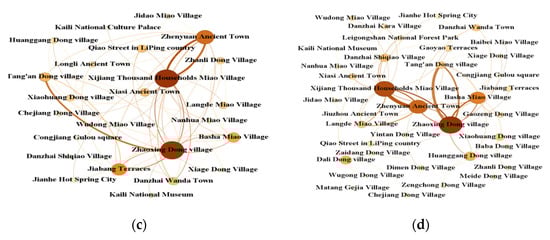 (a) Tourism flow network of Qiandongnan Prefecture in spring. (b) Tourism flow network of Qiandongnan Prefecture in summer. (c) Tourism flow network of Qiandongnan Prefecture in Autumn. (d) Tourism flow network of Qiandongnan Prefecture in winter.