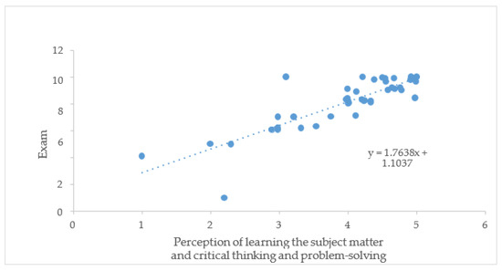 Correlation between scores of the impacts on the learning of the subject matter and critical thinking and problem-solving skills of the survey and exam scores.