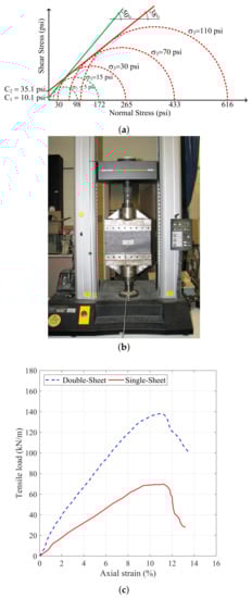 Materials properties: (a) shear strength parameters of the study backfill; (b) uniaxial tensile test of a 300 mm wide by 150 mm long Geotex 4 × 4 PP-woven geotextile; (c) obtained tensile strength of the single- and double-sheet geotextiles (Pham [3]).