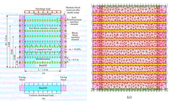 The numerical analysis was carried out in two stages: (i) backfilling and compaction and (ii) surcharge application to the top surface of the SGC mass. The SGC mass was constructed in stages with various thicknesses of soil lift (depending on the reinforcement vertical spacing) placed and compacted until its full height of 2 m was reached. The compaction of each soil lift was modeled by assigning an equivalent uniformly distributed load to the top and bottom surfaces of each soil lift, defined as a Type-II compaction procedure in [27], during the staged construction process (Figure 2b). Two compaction pressures: 44 and 70 kPa were considered in the FE simulation. The compaction pressure of 70 kPa represented the upper limit of the compaction-induced stress of 28.3 kPa or an equivalent total force per unit width of 53.2 kN/m produced by a light compaction equipment, whereas the compaction pressure of 44 kPa represented the compaction pressure induced by the plate compactor MBW–GP1200, as used in the SGC tests by Pham [3]. This compactor and hence the compaction pressure were different from the ones that were used by Mirmoradi and Ehrlich [27]. A confining pressure of 34 kPa, representing the vacuum pressure applied to the SGC mass, was applied to the sides and top boundaries of the following simulated SGC masses. Both the lateral and vertical displacements of the bottom boundary were restrained in the numerical model.