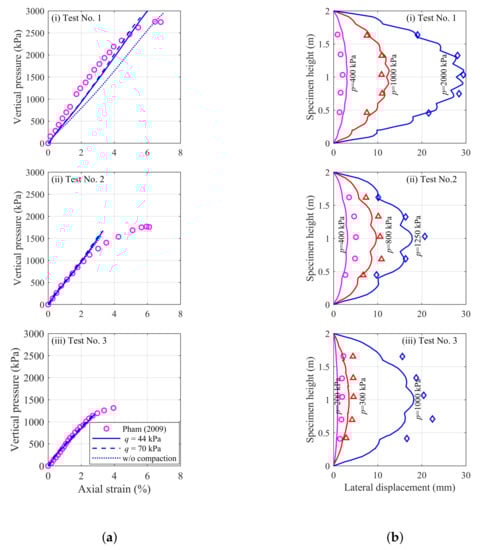 (a) Simulated and measured applied vertical pressure vs. axial strain and (b) simulated (with a compaction pressure of 44 kPa) and measured lateral displacement along the specimen height of the three SGC tests performed by Pham [3].
