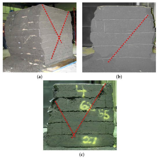 Failure patterns observed from the experimental SGC masses performed by Pham [3]. (a) Test no. 1; (b) test no. 2; and (c) test no. 3.