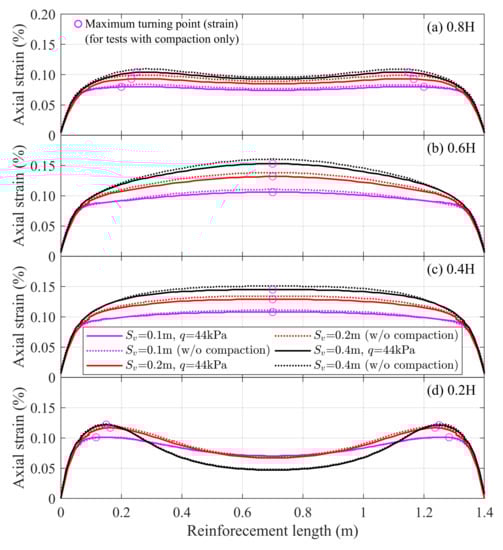 Influence of reinforcement vertical spacing, under a surcharge (service load) of 200 kPa, on the distribution of reinforcement’s axial strain at (a) 0.8 H, (b) 0.6 H, (c) 0.4 H, and (d) 0.2 H of the specimen.