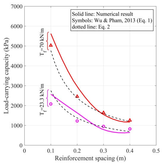 In Figure 6, the analytical load-carrying capacity was obtained using Equation (1), which was proposed by Wu and Pham [30]; in this equation, the confining pressure used was 34 kPa, the largest particle size was 33 mm, the angle of internal friction of the backfill—required for calculating the coefficient of Rankine passive earth pressure —was 50, and the apparent cohesion was 70 kPa. The numerical result for 23.3 kN/m and 70 kN/m are in good agreement with the analytical result.