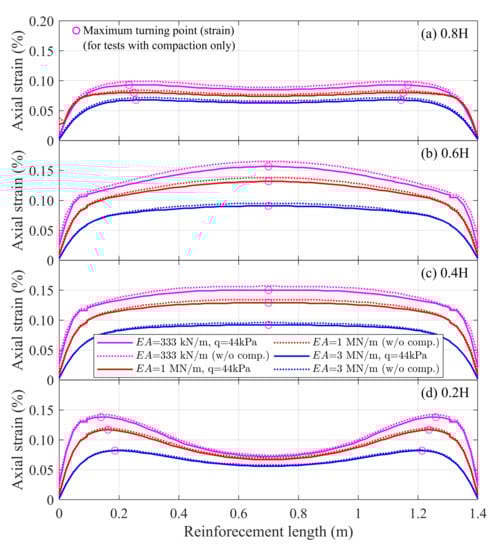 Influence of reinforcement axial stiffness , under a surcharge (service load) of 200 kPa, on the distribution of reinforcement axial strain at (a) 0.8 H, (b) 0.6 H, (c) 0.4 H, and (d) 0.2 H of the specimen.