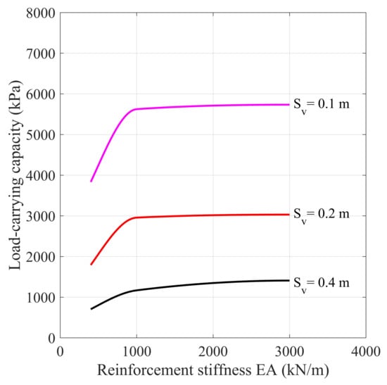 Figure 6 shows the relation between the load-carrying capacity, the reinforcement spacing, and the reinforcement tensile strength of the studied SGC specimen. The simulation procedure for the load-carrying capacity of the SGC specimen was essentially the procedure used in the simulation of the bearing capacity of a footing as outlined in Reference [39], which is via the application of a small incremental load using the multipliers option in the program until failure. In general, the numerical result shows that the load-carrying capacity increases with the increase of the reinforcement strength but decreases with the increase of the reinforcement spacing; hence, using a closer reinforcement spacing allows the use of a reduced reinforcement strength. This finding is in agreement with the result obtained, for examples, by Leshchinsky [43], who found that the spacing between the reinforcement layers could have a major impact on the bearing capacity of an MSE wall-supported footing, and by Xu et al. [44] who found that the load-carrying capacity of a GRS mass was affected by the reinforcement spacing and the reinforcement strength.