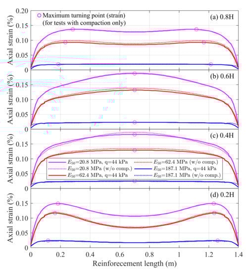 Figure 9 presents the distribution of the reinforcement axial strain placed across the specimen heights of 0.2 H, 0.4 H, 0.6 H, and 0.8 H. Again, it can be seen that the reinforcements located at the lowest (0.2 H) and the highest (0.8 H) heights generated their largest axial strain near both ends of the reinforcement, about 0.2∼0.3 m from its ends, while the reinforcement placed at the middle height of the specimen (0.4 H, 0.6 H) generated their largest axial strain at the midlength of the reinforcement. In general, the axial strain profile increases with a decrease in the secant modulus . For example, for the reinforcement across the height of 0.2 H from the base of the specimen and with a vertical spacing of 0.2 m, the maximum axial strain increased from about 0.12% to about 0.24% when the secant modulus was decreased from 187.1 MPa to 20.8 MPa. Obviously, the secant modulus had a significant influence on the axial strain of the reinforcement. Under the same applied load, as the soil became stiffer, the internal force mobilized in the reinforcement was smaller. This finding is in agreement with the results obtained by Wu et al. [6] and Hoffman and Pham [46]; both reported that the secant modulus was the most important factor influencing the stress–deformation behavior of the GRS mass. However, the variation in the axial strain due to the various compaction effort was, again, found to be insignificant.