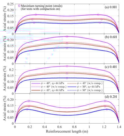 Influence of angle of internal friction, under a surcharge (service load) of 200 kPa, on the distribution of reinforcement axial strain at (a) 0.8 H, (b) 0.6 H, (c) 0.4 H, and (d) 0.2 H of the specimen.