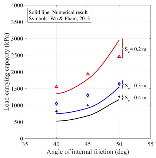 Figure 11 shows the effect of the angle of internal friction of the backfill on the load-carrying capacity of the studied SGC specimen. The load-carrying capacity was found to be proportional to the angle of internal friction, but inversely proportional to the vertical spacing. This numerical finding agrees with the results of Xu et al. [44], in which they concluded that the angle of internal friction of the backfill had a significant effect on the load-carrying capacity of the GRS mass. The numerical result was also compared to the analytical result calculated using Equation (1); both the numerical and analytical results showed the same trend of a nonlinear relation on the load-carrying capacity for the values of the angle of internal friction considered here. In general, the numerical result underestimated the load-carrying capacity calculated by the analytical Equation (Equation (1)).