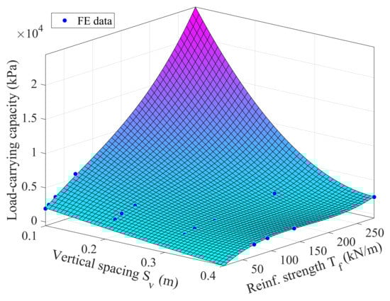 Figure 13 reveals the effects of reinforcement spacing and reinforcement strength on the load-carrying capacity of the study SGC specimen obtained from the FE analysis. To achieve the ratio of 175, 233, 350, and 700, a variety of reinforcement strengths between 17.5 kN/m and 280 kN/m and reinforcement spacings between 0.1 m and 0.4 m were considered. The figure shows that the load-carrying capacity of SGC specimen increases with the increase of the reinforcement strength but decreases with the increase of the reinforcement spacing. On one hand, it can be seen that at the reinforcement strength of 17.5 kN/m, the load-carrying capacity is decreasing linearly with the increase of the reinforcement spacing, while at the reinforcement strength of 280 kN/m, the load-carrying capacity is decaying exponentially with the increase of the reinforcement spacing. On the other hand, the load-carrying capacity is exponentially correlated to the reinforcement strength at the reinforcement spacing of 0.1 m but is logarithmically correlated at the reinforcement spacing of 0.4 m. The logarithmic relation indicates that the reinforcement strength in the SGC specimen could not be efficiently mobilized for enhancing the shear strength of the composite mass and hence its load-carrying capacity.