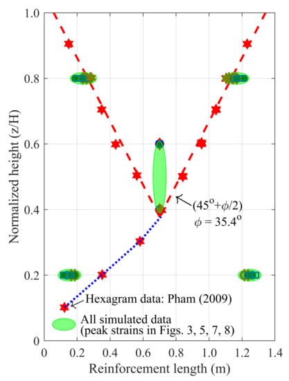 The failure surface observed in the SGC test specimen no. 1 of Pham [3], Figure 14, was also added to this figure using the hexagram; clearly the failure surface is incompletely developed. The failure surface on the right-hand-side of the active wedge continued to develop diagonally downwards following the path of the blue dotted line, which could well be the failure surface or the –slip line of the radial shear (fan) zone. Obviously, one should not expect a complete development of the failure surface beneath the concrete pad (footing) as the composite specimen did not have sufficiently far side boundaries. A rigid boundary, if not a sufficiently far boundary, is required for the generation of a complete failure surface that eventually extends to the top surface [47]. In addition, the soil mass supporting the concrete pad might have insufficient restraint at the side boundaries, which were both wrapped-faces and supported by a confining pressure of only 34 kPa, which was constantly maintained during testing by a vacuum pressure of 34 kPa.