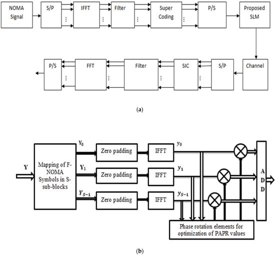 The representation of the NOMA structure is specified in Figure 1a. NOMA is considered to be one of the primary contenders for 5G radio. The characteristics of NOMA, such as low outages, high data rates, high bandwidth, and the ability to connect multiple devices, make it suitable for 5G. However, high PAPR significantly reduces the performance of NOMA wave forms [].