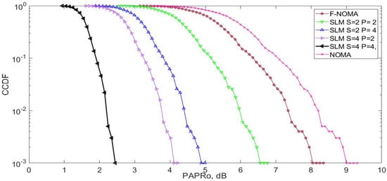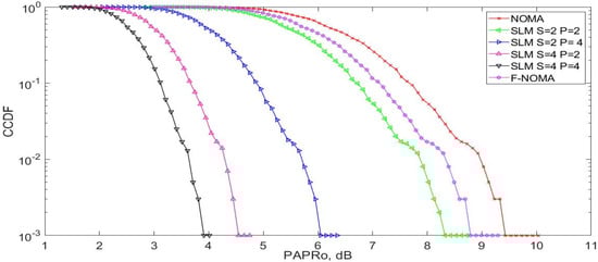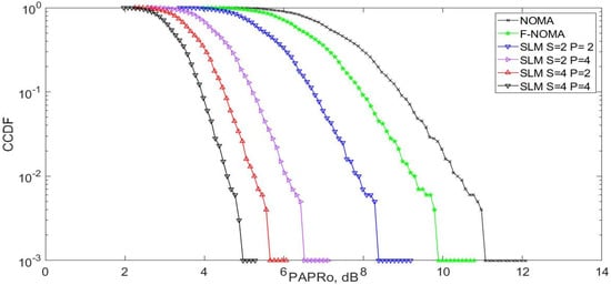 Figure 2 investigated the efficiency of the suggested SLM for 16-QAM NOMA. At the CCDF of 10−3, the PAPR of conventional NOMA and F-NOMA is 9.4 dB and 8.2 dB, respectively. The SLM mode is applied to F-NOMA to lower the PAPR. It is shown that the PAPR is reduced to 2.4 dB, 4 dB, 4.8 dB, and 6.6 dB for SLM (S = 4 p = 4), (S = 2 p = 2), (S = 2 p = 2), and (S = 2 p = 4), respectively. Hence, it is concluded that SLM (S = 4 p = 4) outperforms conventional SLM. The PAPR analysis of 64-QAM for the proposed SLM algorithm is given in Figure 3. At the CCDF of 10−3, PAPR is lowered to 5.2 dB, 5.9 dB, 7 dB, and 8.2 dB for SLM (S = 4 p = 4, S = 4 p = 2, S = 2 p = 2, and S = 2 p = 4). Therefore, it is shown that SLM attained a 5.8 dB better performance as equated with the conventional NOMA framework. In Figure 4, the PAPR of 256-QAM for the F-NOMA waveform is shown. At 10−3 CCDF, SLM (S = 4 p = 4) obtained a gain of 0.89, 1.8, and 4 dB, correspondingly.
