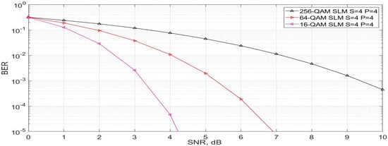 To examine the throughput of a Power Amplifier (PA) utilized in the NOMA framework, the BER analysis of the recommended SLM is given in Figure 5. It is seen that the BER of 10−3 is achieved at the SNR of 5.3 dB for SLM (S = 4 p = 4), 6.5 dB for SLM (S = 4 p = 2), 7.7 dB for SLM (S = 2 p = 4), 8.6 dB for SLM (S = 2 p = 2), 10.6 dB for F-NOMA, and 12.1 dB for NOMA, respectively; hence, it is concluded that the BER is effectually enhanced for projected method.
