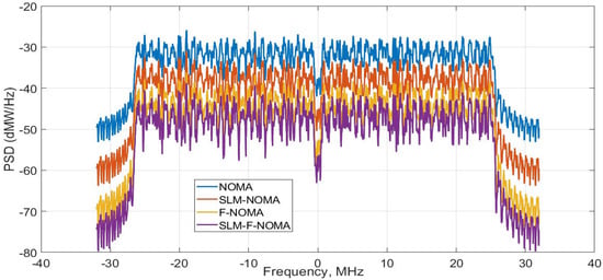 The PSD of the NOMA and F-NOMA with SLM is estimated and analyzed in this section. From Figure 6, it is seen that the spectrum emission of NOMA is −50 dB and F-NOMA is −71 dB. This indicates that the F-NOMA efficiently reduces the OOBE as equated with the NOMA. The OOBE of the NOMA and F-NOMA with SLM is estimated and given as −63 dB and −80 dB, respectively; therefore, it is determined that the spectral efficiency of the F-NOMA is efficiently enhanced and outperforms the conventional NOMA.