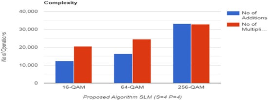 In this segment, we have estimated the complexity of the system by considering n = 64, S = 4, and p = 4 given in Table 3 and Figure 7. The number of additions and multiplications required by SLM (S = 4 p = 4) for 16-QAM is 12,288, 20,480, 64-QAM is 16,384, 24,576, and 256-QAM is 33,088, 32,768, respectively. Hence, it is concluded that the complexity of the framework will increase with high order transmission schemes such as 256-QAM.