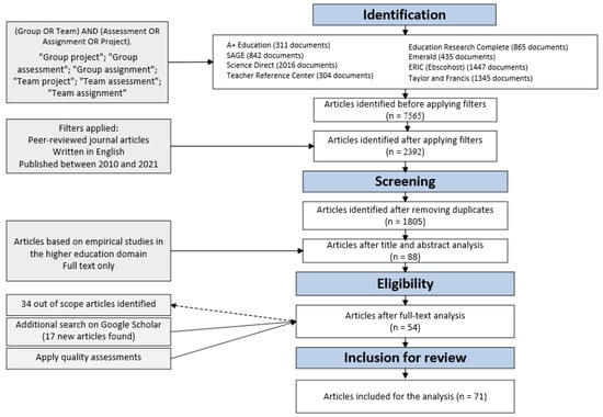 Chicago/Turabian StyleTumpa, Roksana Jahan, Samer Skaik, Miriam Ham, and Ghulam Chaudhry. 2022. "A Holistic Overview of Studies to Improve Group-Based Assessments in Higher Education: A Systematic Literature Review" Sustainability 14, no. 15: 9638. https://doi.org/10.3390/su14159638