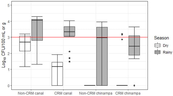 Figure 3 shows the temporal variation between the dry and rainy seasons of fecal coliforms (FC), as indicator bacteria, in water samples taken from non-CRM and CRM canals, and in lettuce produced by non-CRM and CRM chinampas in Xochimilco. The bacterial densities obtained in the water per 100 mL were integrated with those found in lettuce per 100 g in order to present the bacterial loads of the irrigation water and the product together. The red line represents the maximum permissible limit established by the NOM-EM-034-FITO-2000 regulation for FC in water reused for vegetables (2000 colony-forming units per 100 mL; CFU/100 mL).