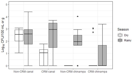 Figure 4 shows the temporal variation between the dry and rainy seasons of Escherichia coli (E. coli), as a potential bacterial pathogen, in water samples taken from the non-CRM and CRM canals, and from lettuce produced by non-CRM and CRM chinampas in Xochimilco. There is no permissible limit stipulated in the Mexican normativity for E. coli.