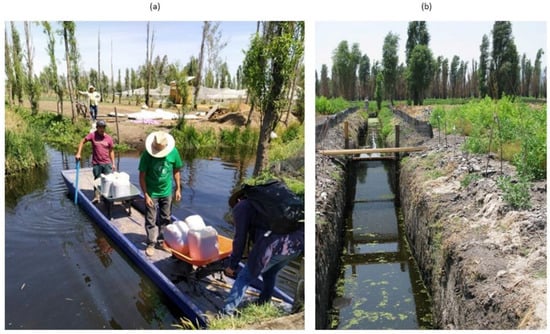 The chinampa system is made up of agricultural islands (chinampas) on the wetland surface. Chinampas are structured and maintained in place by Bonpland willow trees (Salix bonplandiana), using high-fertility sediments obtained from the bottom of the wetland. Historically, irrigation water was obtained through capillarity [], as each chinampa is surrounded by water canals (Figure 2), but at present, water is pumped from adjacent canals. This agricultural system is one of the most diverse and productive systems in the world []. The creation of this cultivation technique by chinampa producers allowed the sustainable provision of food for one of the most important urban centers in Mesoamerica [].