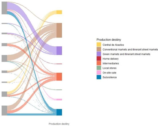 The commercialization routes are variable. The production may be sold directly to consumers in “green” or conventional markets, intermediaries, or through commercialization networks. Some producers also direct their production to the Central de Abastos, the largest-scale market that centralizes and monopolizes agri-food commercialization in Mexico City. On average, 11.3% of all production is directed for subsistence (Figure 6).