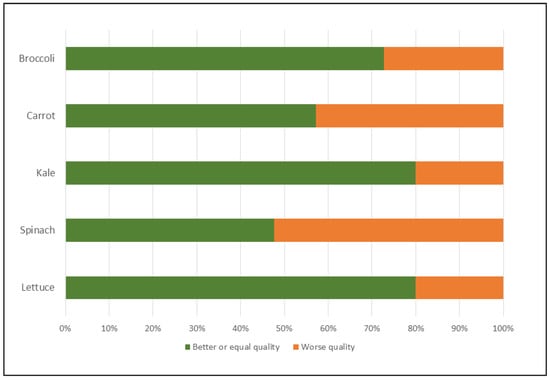 Access to gourmet and alternative markets and the possibility of obtaining fair prices also depend on the quality of the products, as perceived by consumers. Figure 7 depicts the comparison of the sensorial attributes between CRM and conventional products. All of the products showed a larger percentage of attributes that were superior or equal to their conventional counterparts, except for spinach.