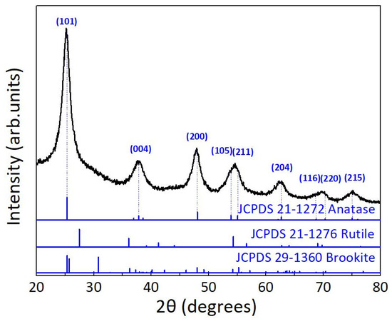 Figure 2 shows the experimental XRD diffractogram of the TiO2 nanopowder. All experimental peaks are fully assigned to TiO2 tetragonal anatase phase (JCPDS 21-1272), and correspond to the reflections (101), (004), (200), (105), (211), (204), (116), (220) and (215) at 2θ = 25.3, 37.8, 48.0, 53.8, 54.9, 62.8, 68.9 and 75.0°, respectively. No peaks related to other TiO2 crystalline phases (brookite or rutile) were observed. Moreover, no impurities were detected, such as Ti(OH)4 [45,68]. The XRD results also demonstrate that the materials are well crystallized and the broad diffraction peaks indicate the presence of very small sized crystallites [45,68]. Some contribution from the cork’s chemical components released during synthesis, especially due to the brown color of the resulting powders, was expected. However, it was not confirmed by the XRD results.