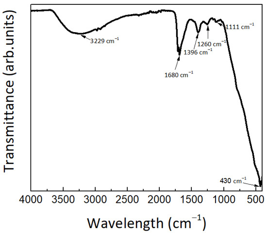 The TiO2 nanopowder was also investigated using FTIR and the result is presented in Figure 4. The appearance of a broad band between 3000 and 3600 cm−1, as well as the band at 1680 cm−1, indicates the presence of hydroxyl groups, due to the adsorption of water from the surrounding environment [43,50,71,72]. For the lower wavenumber region, a peak located at around 1111 cm−1 is visible and attributed to the stretching vibration of the Ti-OH bond [50], whereas the peaks located at 438 cm−1 and 1396 cm−1 are attributed to Ti–O bending [73] and Ti-O-Ti stretching modes [74], respectively. Other peaks corresponding to vibrational modes of residual organic species were also observed. FTIR stretching band at 1680 cm−1 is likely related to C=O groups [75,76], while the broad and small peak that appears at 1260 cm−1 is probably ascribed to C–O stretching mode from groups such as ethers (common linkages in lignin [77]), alcohols, esters, lactones, phenols or carboxylic acids [78], all present in cork’s chemical composition [79,80,81].