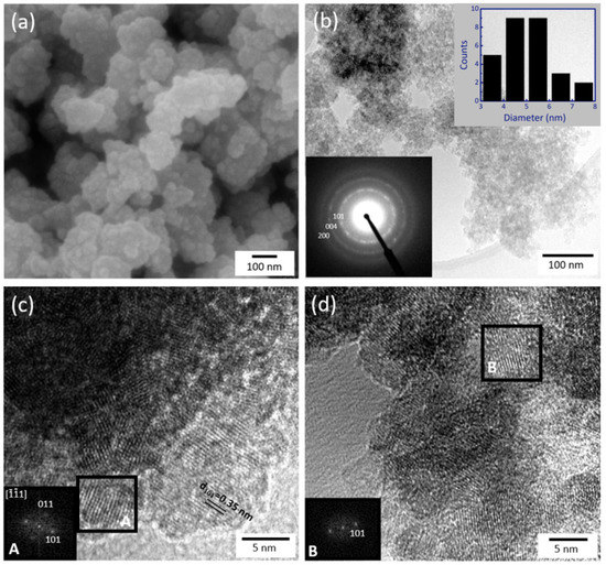 Figure 5 shows the SEM and TEM images of the TiO2 nanopowder synthesized under microwave irradiation. From the SEM image (Figure 5a), it canbe observed the formation of nano-sized particles largely agglomerated. Nevertheless, from TEM, it could be perceived that these agglomerates are formed by very fine nanoparticles, displaying a nearly spherical shape (Figure 5c,d). The average particle size was found to be 4.86 ± 1.31 nm. The inset in Figure 5b also shows the particle size distribution, revealing that smaller particles in the range of 4–6 nm are more likely to be found. The ring diffraction pattern in Figure 5b attested that these particles are solely from the anatase phase. Moreover, the fast Fourier transform (FFT) images and the lattice spacing (~0.35 nm) correspond to the (101) planes of anatase TiO2 nanocrystals, Figure 5c,d. From the FFT image in Figure 5c, taken in the area indicated as A in the black square, it can be observed that two sets of lattices are present and that they are not perpendicular to each other with an equal lattice spacing of ~0.35 nm, corresponding to the (101) and (011) planes of the anatase phase. Observed through the [11] zone axis, the angle inferred between both (101) and (011) is 82° in accordance with the theoretical value reported for pure TiO2 anatase (JCPDS 21-1272).