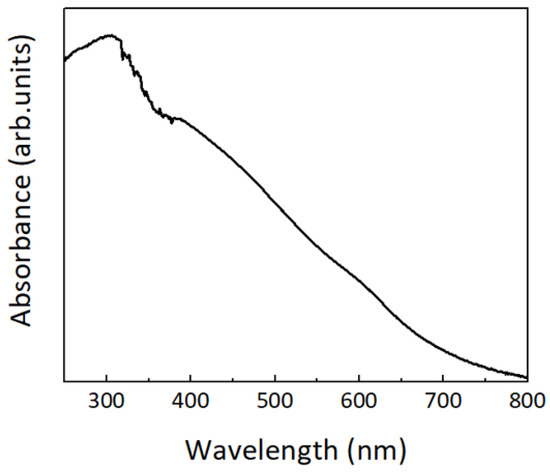 The optical properties of the produced TiO2 nanopowder (in the presence of the cork substrates) were investigated by recording the UV–VIS absorption spectrum (see Figure 6). As observed in Figure 6, an absorption maximum is obtained in the UV region, around 306 nm (~4.1 eV), and the absorption is seen to extend throughout the visible region. For comparison, the absorption spectrum of the TiO2 nanopowder synthesized in the absence of the cork substrates was also recorded (Figure S2). In this last case, even though the absorption maximum is placed at the same value as in Figure 6, no absorption occurs beyond 400 nm as expected, since pure TiO2 presents a wide band gap value (around 3.2 eV for pure TiO2 anatase nanoparticles [45,83,84]). It can thus be concluded that the visible light absorption in Figure 6 may be attributed to the presence of binders that were transferred from the cork during microwave synthesis and resulted in brown TiO2 nanopowders. In fact, several studies have reported the impact of different binders on the TiO2 nanostructures, with these extractives interacting with the nanostructures and modifying their morphology, size and optical properties [85,86,87].