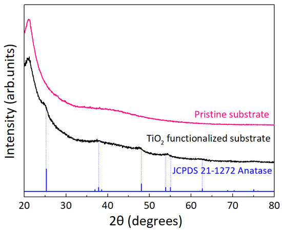 XRD analyses were also carried out for the pristine cork substrate and for the TiO2 functionalized cork substrate (Figure 7). It can be observed that the pristine cork substrate shows a broad peak centered at around 2θ = 21°, indicating its amorphous nature [88,89]. When it comes to the functionalized cork substrate, five weak and broad peaks were detected, which can be associated with the presence of anatase. The XRD peaks observed at 25.3, 37.8, 48.0, 53.8, and 54.9° correspond to the (101), (004), (200), (105) and (211) reflections of the TiO2 anatase phase. The results corroborate the XRD data obtained for the TiO2 nanopowder (Figure 2), confirming the presence of TiO2 anatase nanostructures at the surface of the cork.