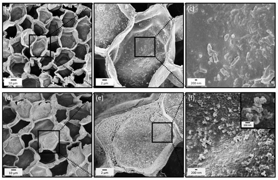 SEM images of the pristine cork substrates (a–c) together with the TiO2 functionalized ones (d–f). The inset in (f) shows a TiO2 nanoparticles’ agglomerate at the interior of a cork’s cell.