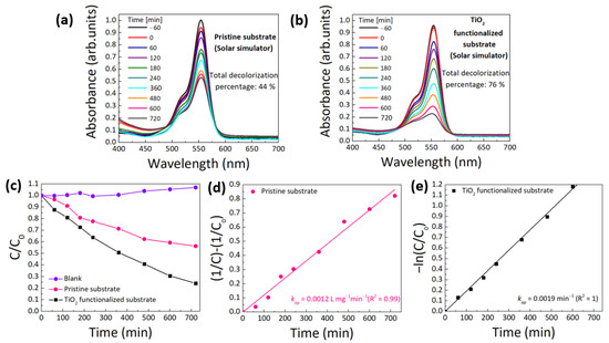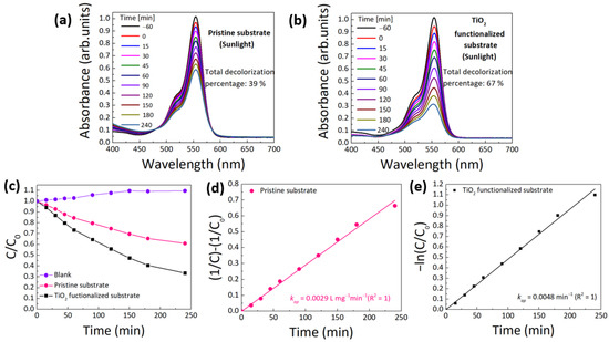 RhB absorbance spectra under natural sunlight up to 4 h (240 min) for cork substrates: (a) pristine substrate and (b) TiO2 functionalized substrate. (c) Decolorization ratio (C/C0) of RhB dye without any substrate (blank), with the pristine and TiO2 functionalized cork substrates, (d) pseudo-second-order kinetics for RhB decolorization in the presence of the pristine substrate and (e) pseudo-first-order kinetics for RhB decolorization in the presence of the TiO2 functionalized substrate.
