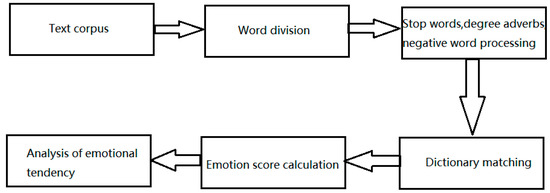 The research methods for affective tendencies and psychological analysis mainly include the questionnaire method, case analysis method, expert interview method, and so on. In this paper, sentiment analysis methods based on big data and sentiment dictionaries are applied, compared with other research methods, which have the advantages of high work efficiency and a large data volume. It is also more intuitive for microblog text to be directly expressed as public emotions. The overall experimental process is shown in Figure 1. The whole process of data mining includes data filtering, data preprocessing, design modeling, classification, and feature analysis. Social media platforms have massive amounts of textual data that generally contain user attitudes towards various topics. The big data method can analyze the attitudes and concerns of user groups with different characteristics, which can make a variety of disordered data orderly. First, we crawled the text of users who were concerned about the epidemic in Shanghai and obtained relevant content by searching keywords. Then, these data were cleaned, which belongs to the data preprocessing in data mining. The cleaned data were matched with the appropriate dictionary so that the text content could be quantified. Finally, a sentiment analysis was carried out by combining the user’s feature tag and publishing time. Sentiment analysis was the main method of this data mining.