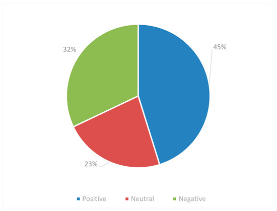 After scoring 131,467 data, the results showed that there were 59,401 positive data, accounting for 45.18%, and 42,142 negative data, accounting for 32.55%. There are 29,924 neutral attitude corpora, accounting for 22.76%, as shown in Figure 2. It can be seen that, although the proportion of positive corpus is the highest, the proportion of negative corpus is still very high, close to one third. This shows that it is highly necessary to determine the psychological state of the public. The total average emotion score is 2.11. The overall sentiment of the public from 24 March 2022 to 26 April 2022, is positive. Differences in the amount of text should be considered when evaluating data within a specific range. The average emotion score (total emotion score of all corpora/number of corpora) within the eigenvalue range is used as the emotion score label, and the following emotion scores refer to the average emotion score.